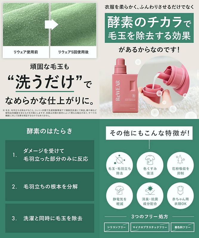 セルラーゼ酵素が毛玉や毛羽立ちによるくすみを除去して本来の色艶を再生してくれる柔軟剤です☆