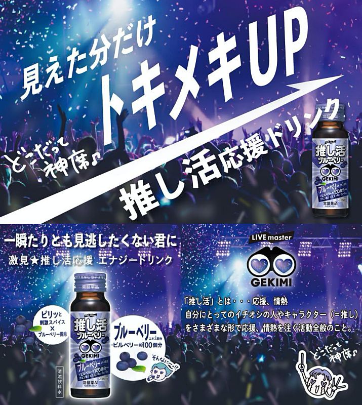 推し活応援用のブルーベリーエキス配合エナジードリンクです。どんな席でも推しの姿を目に焼き付けたい→目に良いブルーベリードリンクという事でしょうか?